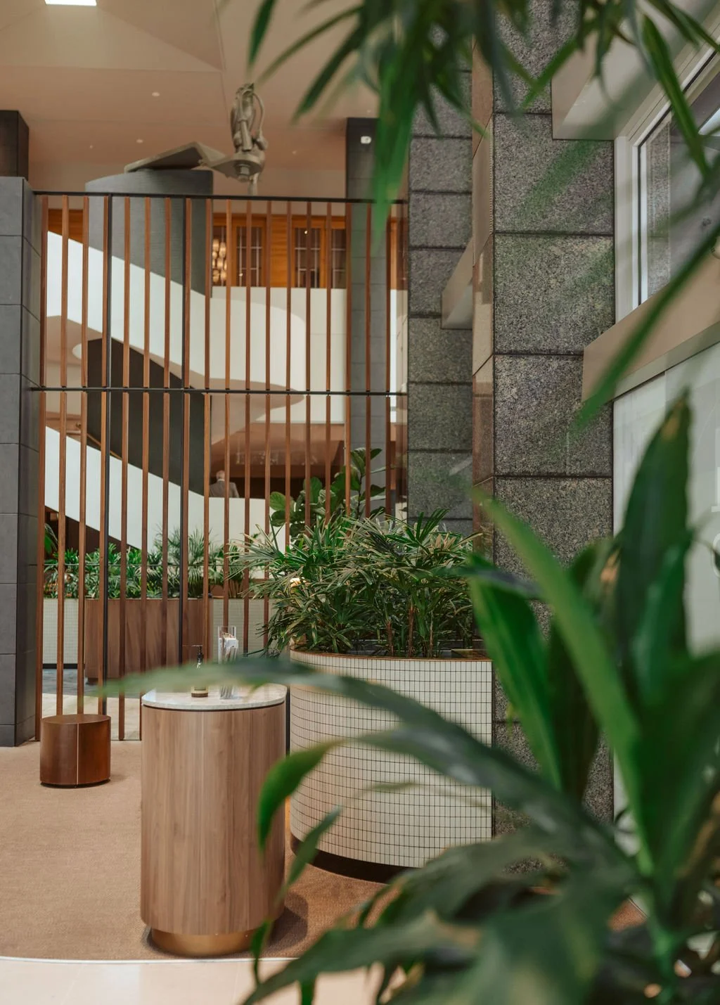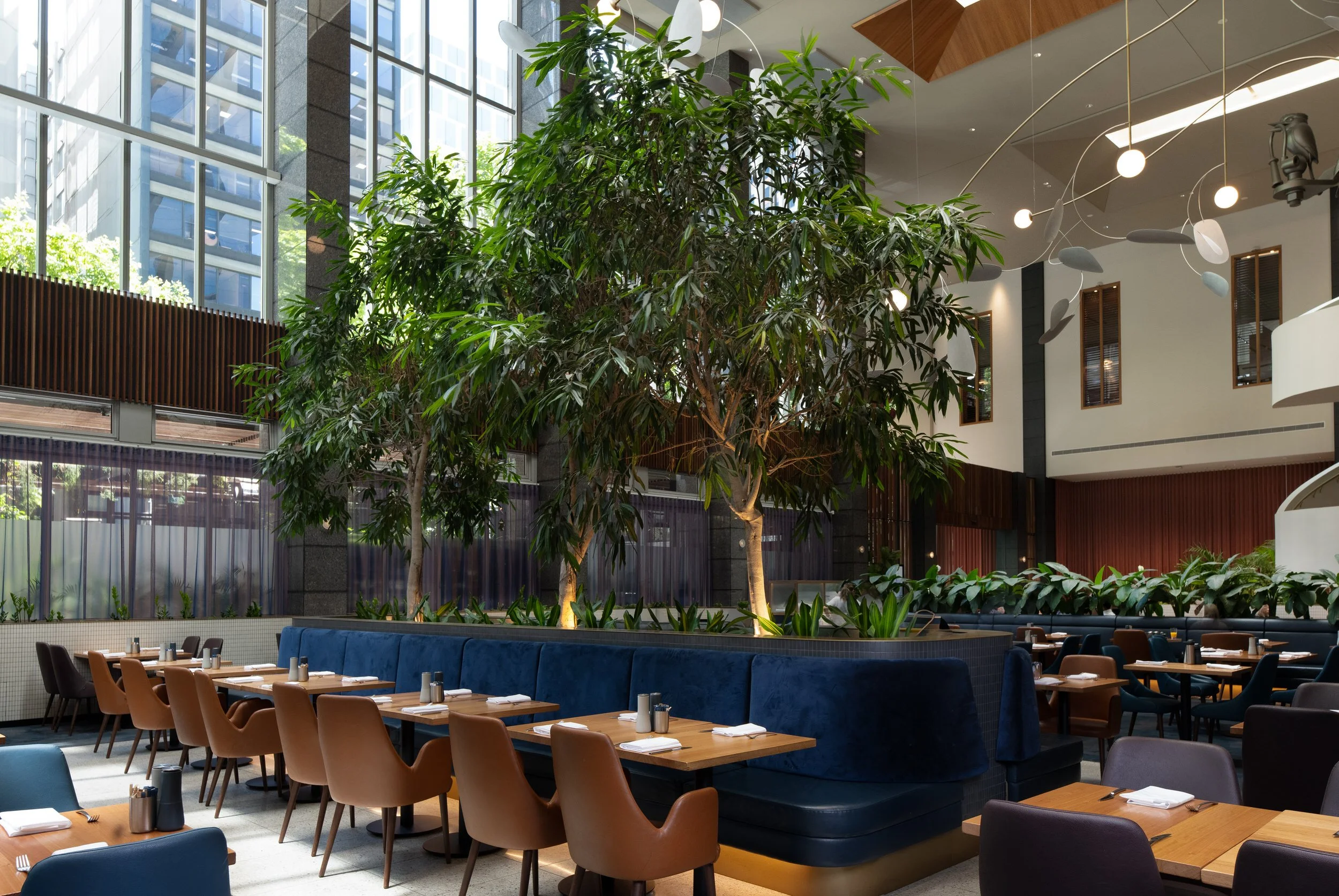 A bold shift from tradition, this verdant transformation breathes new life into the RACV City Club. Once-formal dining spaces now flourish with curated planting in fixed planters and freestanding vessels—working in dialogue with the architecture and energising the mood. Three advanced Ficus longifolia, sourced and transported from Australia's northern reaches, anchor the composition in the atrium style dining room, while layered foliage throughout the Club introduces a rich interplay of scale, texture, and tone—establishing a calm yet dynamic rhythm through the spaces.