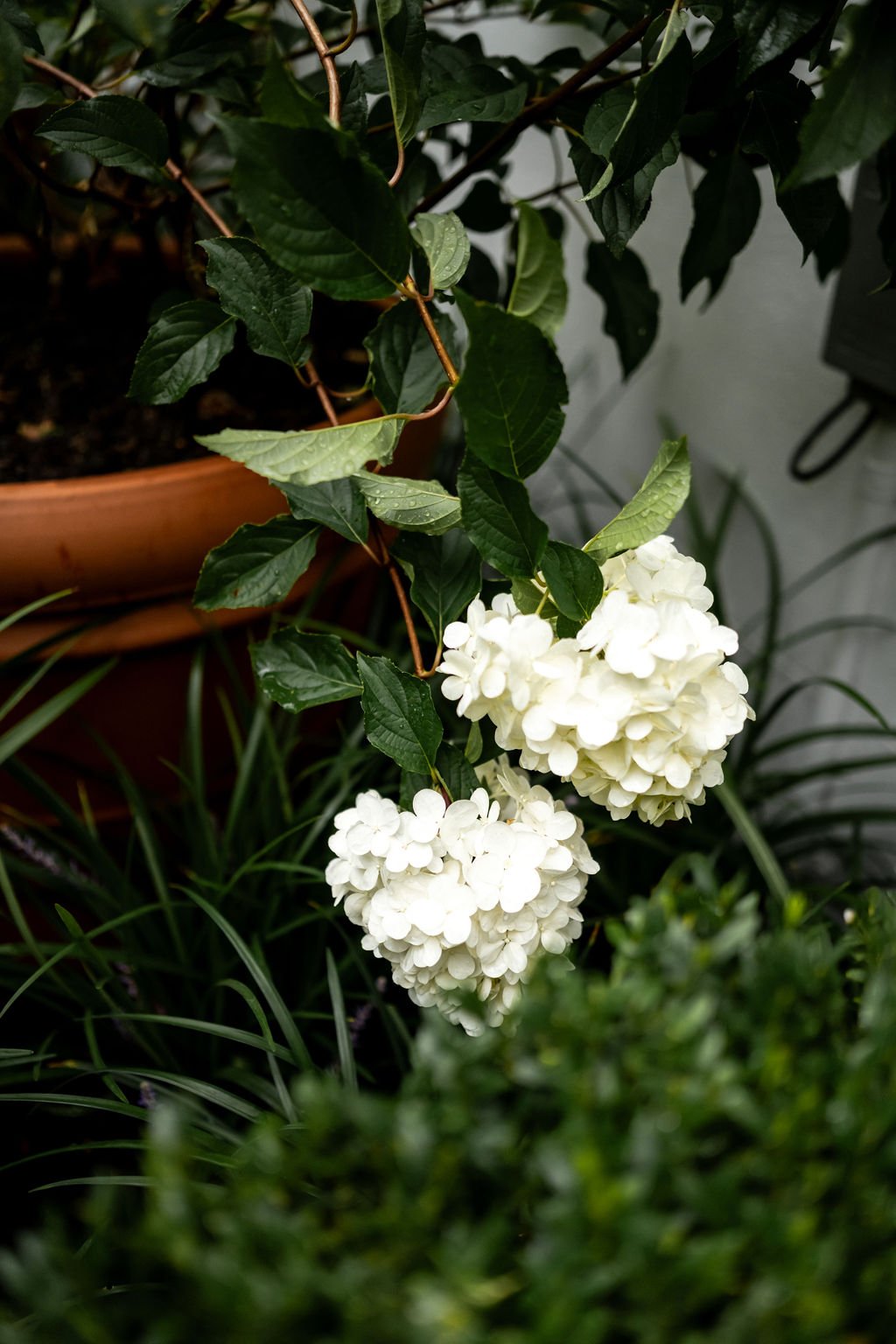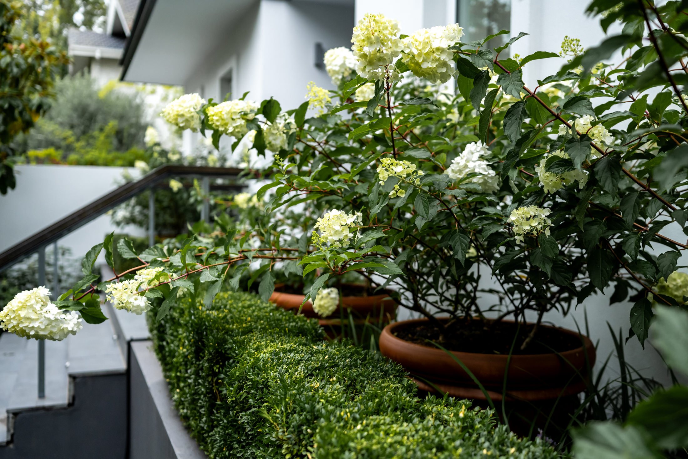 The design focuses on structure repetition and restraint. Entry sequences are defined by layered planting and controlled form, including advanced Hydrangea paniculata set within oversized traditional terracotta pots and connected by Liriope muscari 'Evergreen Giant' underplanting and clipped Buxus sempervirens, introducing a soft yet measured sense of maturity to the front garden. Elsewhere layered foliage and controlled mass planting shape sheltered courtyards and poolside spaces, allowing privacy and greenery to sit comfortably within the architecture without visual dominance. Each planting selection emphasises longevity and seasonal rhythm, allowing the landscape to shift subtly over time while maintaining a composed character appropriate to its neighbourhood.